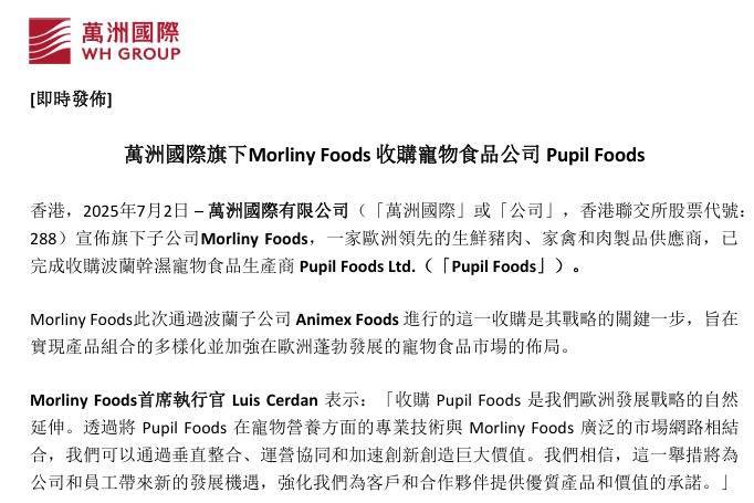 万洲国际表示,Morliny Foods此次通过波兰子公司Animex Foods进行的这一收购是其战略的关键一步,旨在实现产品组合的多样化并加强在欧洲蓬勃发展的宠物食品市场的布局。